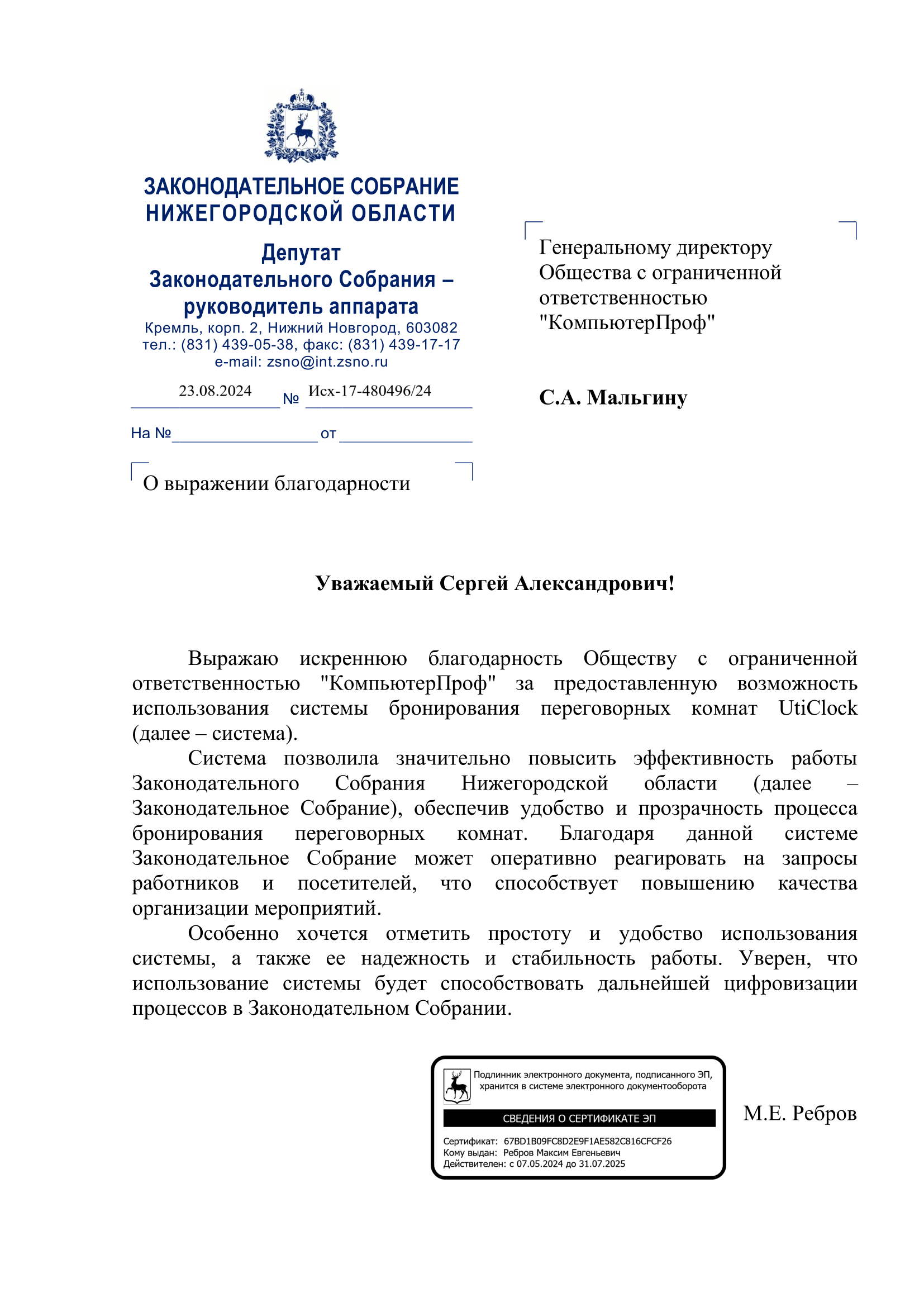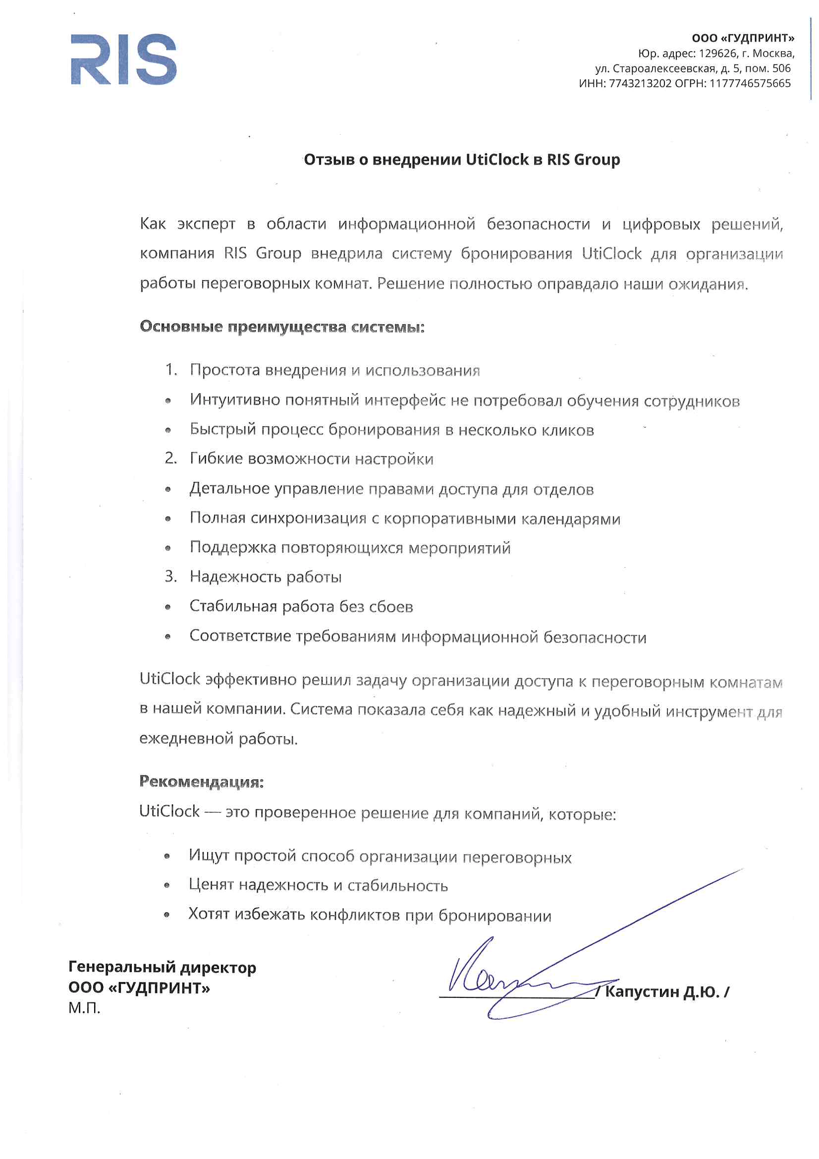 Как эксперт в области информационной безопасности и цифровых решений, компания RIS Group внедрила систему бронирования UtiClock для организации работы переговорных комнат. Решение полностью оправдало наши ожидания.