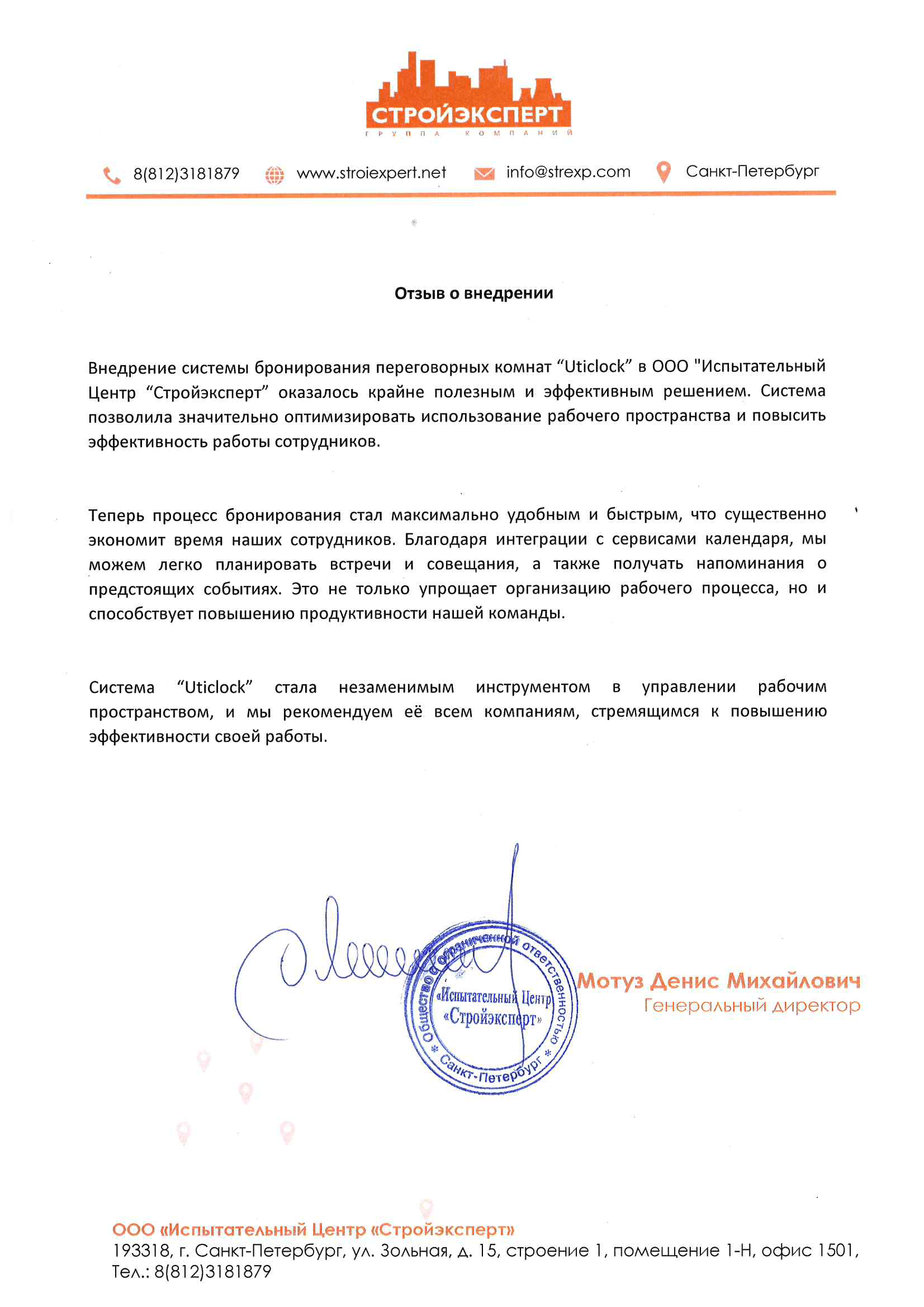 Внедрение системы бронирования переговорных комнат "Uticlock" в ООО "Испытательный Центр "Стройэксперт" оказалось крайне полезным и эффективным решением. Система позволила значительно оптимизировать использование рабочего пространства и повысить эффективность работы сотрудников.