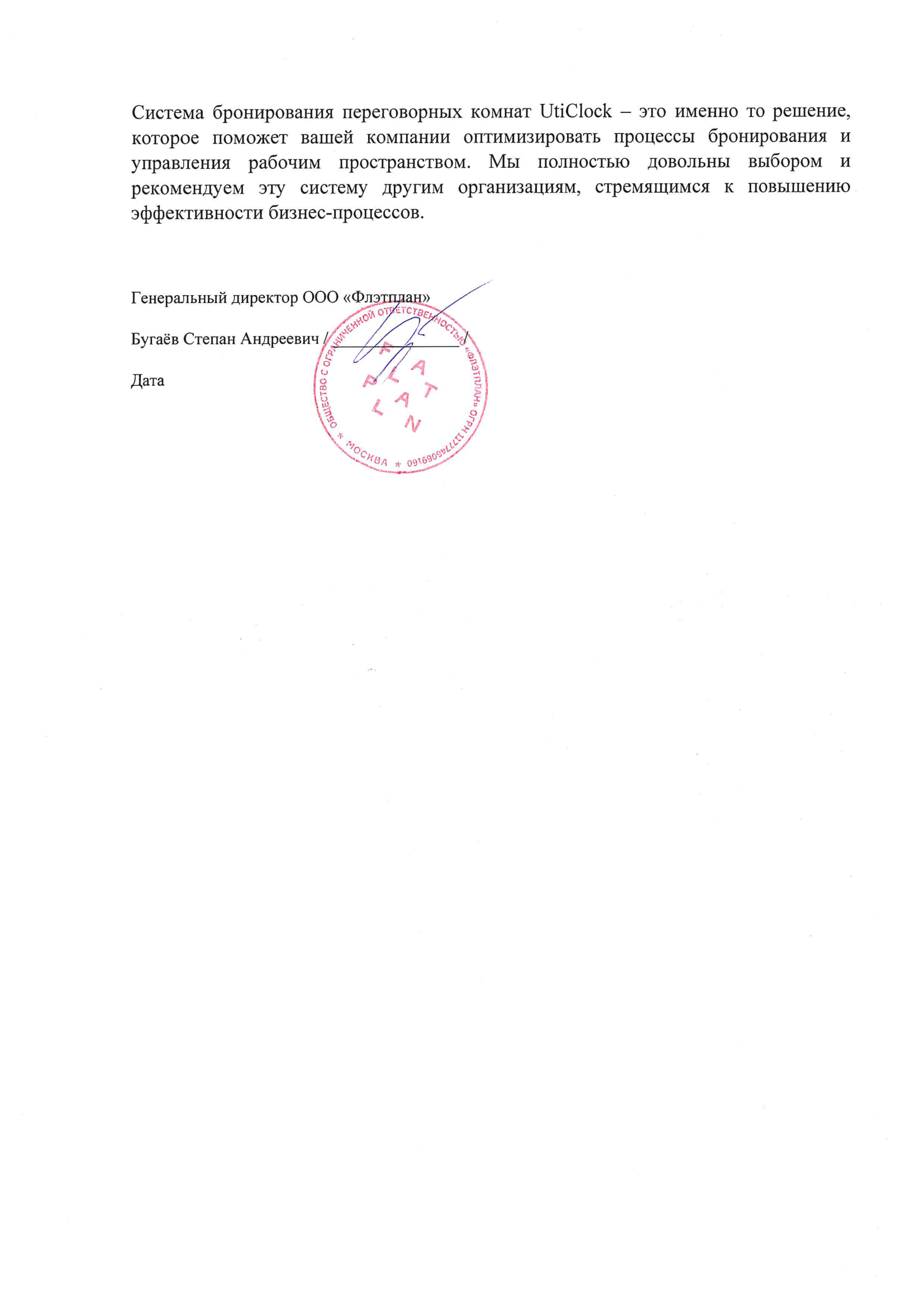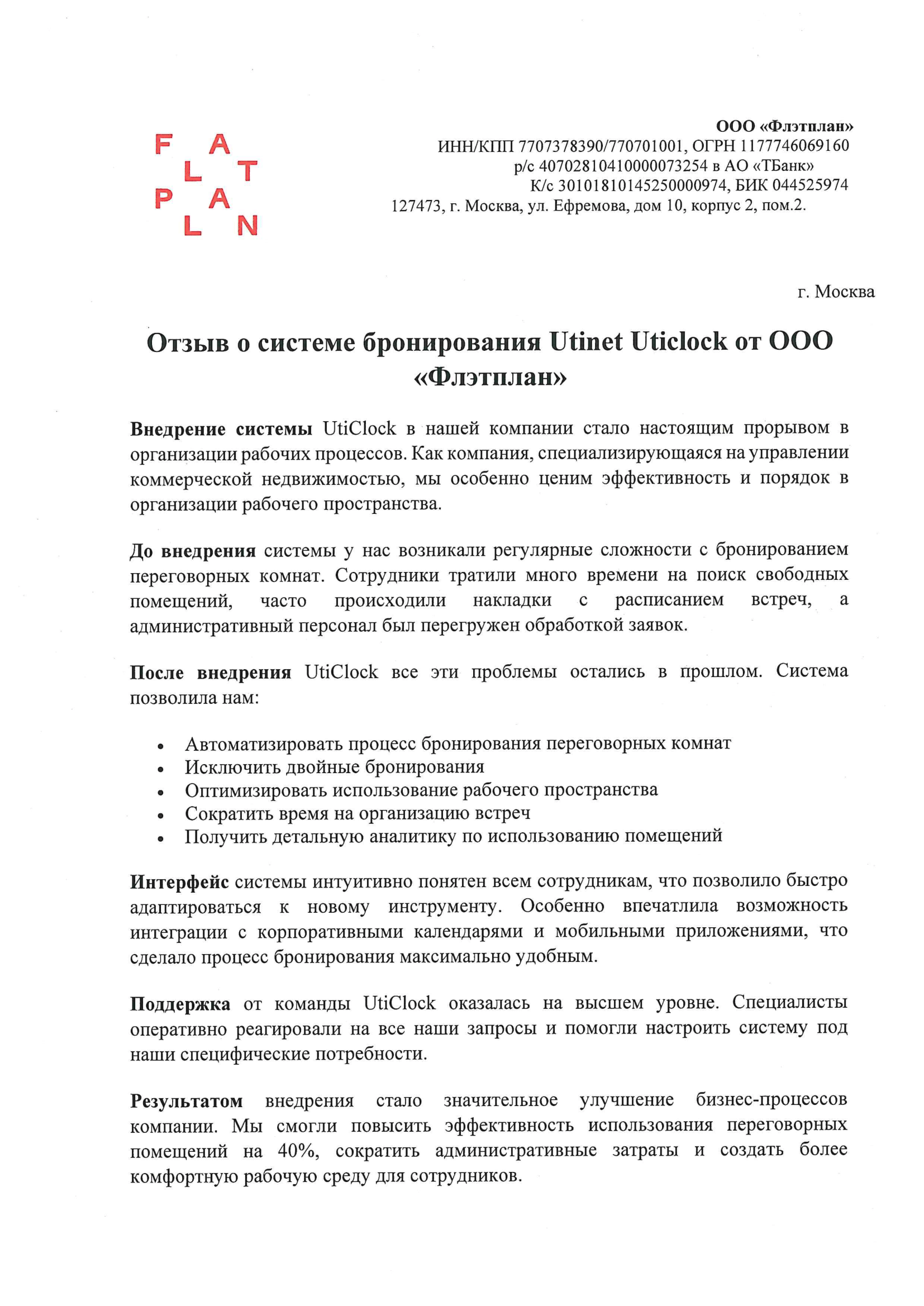Благодаря внедрению UtiClock нам удалось значительно повысить эффективность использования переговорных комнат. Брони помещений видны удалённым сотрудникам, тем, кто работает в офисе и тем, кто непосредственно использует переговорную комнату в текущий момент времени.